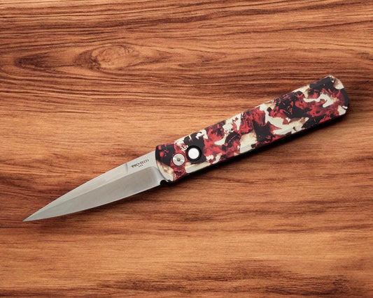 Pro-Tech 921.Satin.CTC Godfather AUTO - "Crimson Tiger Camo" Custom Ano Handles - Satin 154CM Blade - MOP Button