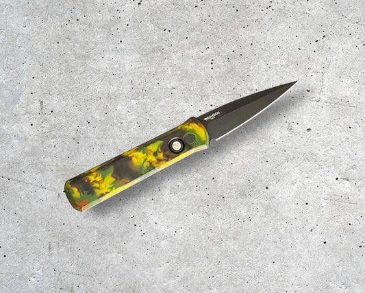 Pro-Tech 721.LH.WOODLAND Godson AUTO - LEFT HANDED MODEL - WOODLAND CAMO Custom Anodized Handle - Black DLC 154CM Blade - Black Lip Pearl Button - Black Hardware