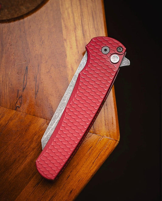 Pro-Tech BSA25 Malibu - Battle Worn Red "Dragon Scale" Handle - Acid Washed Reverse Tanto Magnacut Blade - Black Lip Pearl Button /215