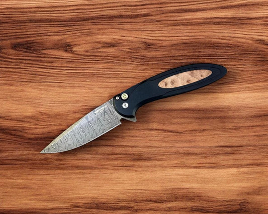 Pro-Tech Custom Cambria (2025 Cambria Custom 005) - Black 6061 Aluminum Handles with Custom Maple Burl Inlay - Chad Nichols Ladder Damascus Blade - Mosaic Push Button - Black DLC Titanium Clip /50