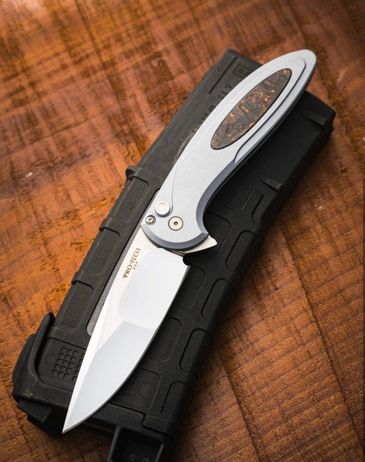 Pro-Tech Custom Cambria (2025 Cambria Custom 004) - Grey 6061 Aluminum Handles with TechnoCarbo Copper Inlay - Mike Irie Compound Ground Blade Blade - Black Lip Pearl Button - Satin Hardware /80