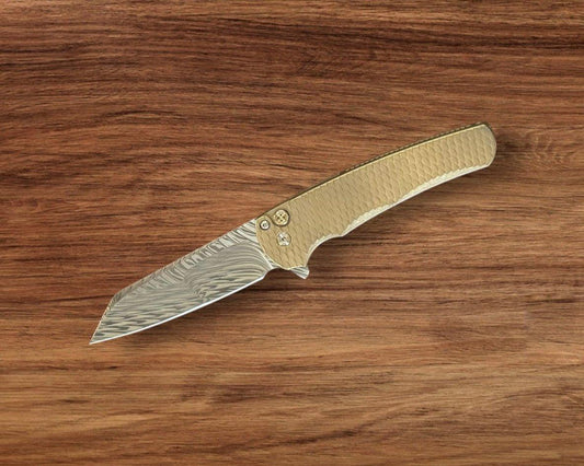 Pro-Tech Custom Malibu Blade Show Atlanta 2024 Exclusive Malibu - Distressed A1Bronze "Dragon Scale" Handle - Mike Irie Compound Hand Ground Mirror Polish Wharncliffe Blade - Mosaic Pin Push Button - Blue Titanium Clip /40